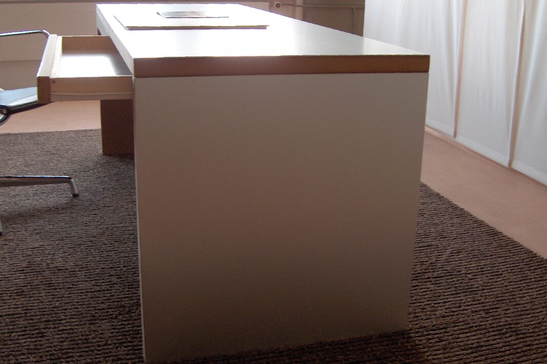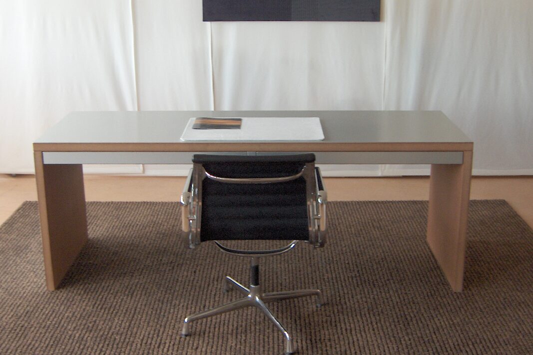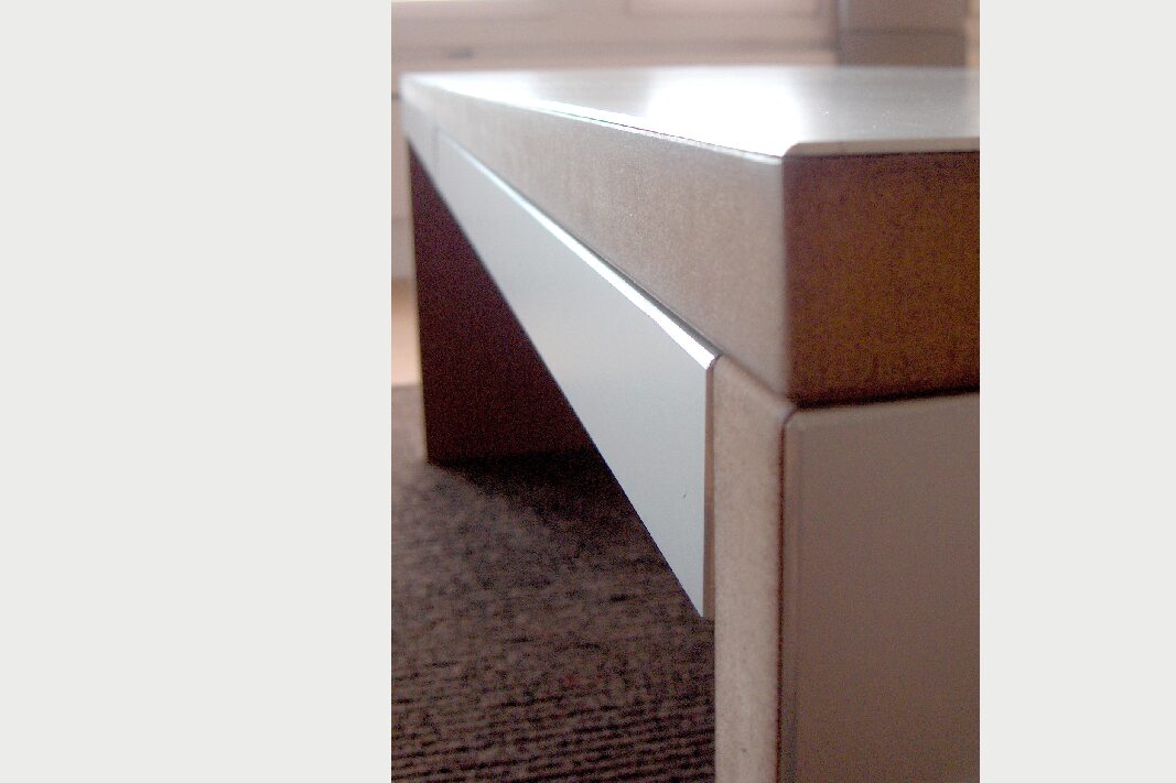 Ein moderner Büro- und Schreibtisch aus Alublech und MDF – klar in der Form, hochwertig in den Materialien und geschaffen für stilvolles, effizientes Arbeiten.