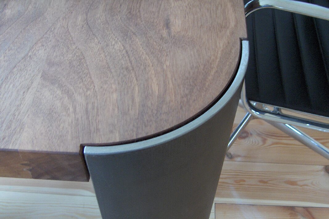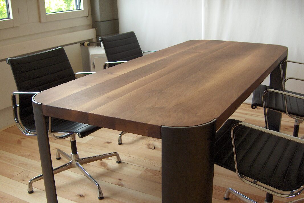 Ein markanter Tisch mit gewalkten Stahlblechbeinen und massiver Nussbaumholz-Tischplatte – robust, elegant und mit einer natürlichen Wärme, die jeden Raum prägt. Jedes Detail verbindet handwerkliche Präzision mit zeitlosem Design.
